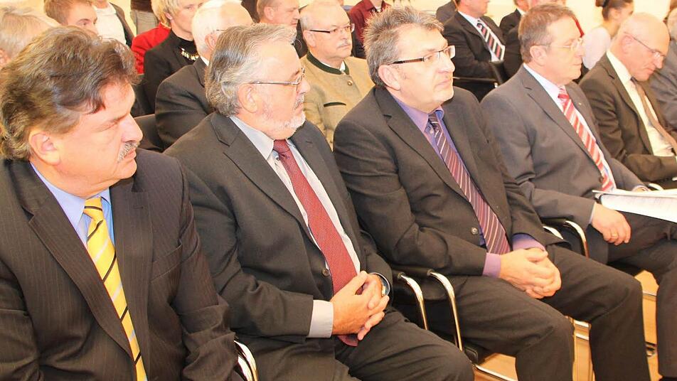 Im Beisein der Bezirkstags fraktionsvorsitzenden Wolfgang Hoderlein (SPD) und Klaus Förster (FW) und des Kulm bacher Bezirksmedaillenträgers Wolfgang Protzner (CSU) hebt Oberbürgermeister und Bezirkstagsvizepräsident Henry Schramm (CSU) Zahrs Verlässlichkeit, sein großes Herz und seine Leidenschaft hervor.