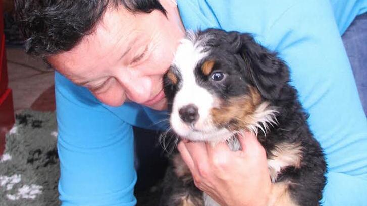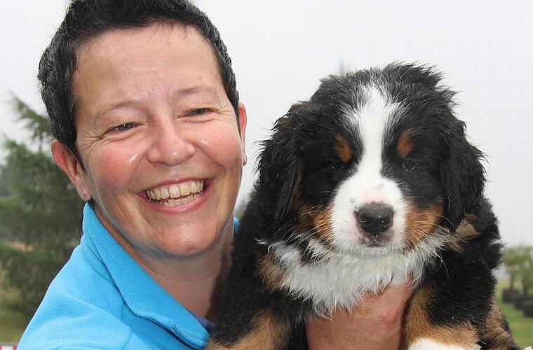Annett Walther ist die "Sitterin" und Welpenbetreuerin. Ihr Mann Falk hat die Berner Sennenhunde bei einem Aufenthalt in der Schweiz vor vielen Jahren kennen gelernt und war sofort Feuer und Flamme für die ruhigen und herzensguten Riesen. Und auf seine Frau Annett ist der Funke der Liebe übergesprungen. Derzeit bereiten sich beide schon auf die Zeit nach der Welpenaufzucht vor. Annett Walther hat Namensbändchen für die Welpen zur Geburt machen lassen, die sie den künftigen Besitzern mitgeben wird.