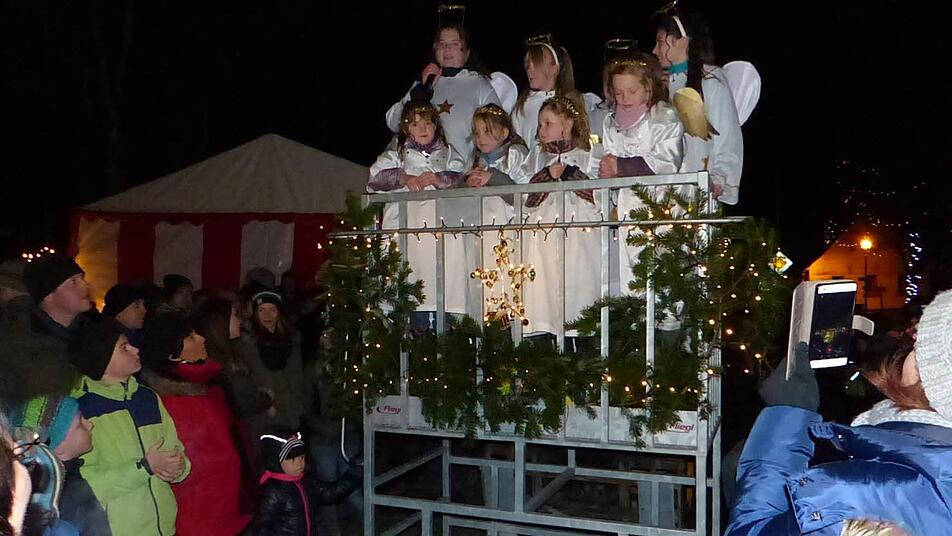 Der Kindergarten "Pfiffikus" aus Eppenreuth bot bei seinem Adventsmarkt hübsche Basteleien und Präsente an, die gerne gekauft wurden. Mit fröhlichem Gesang stimmten die Kinder die Besucher auf das Kommen der Engel ein, die in luftiger Höhe herbeischwebten.