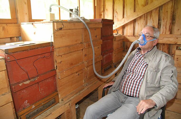 Von der Atemmaske führt ein Schlauch zu den Bienenbeuten, wie Imker die Behausungen nennen. Der Schlauch endet in einem kleinen Ventilator in einem Kästchen. Dieses wird auf das Futterloch der Bienenstöcke gesetzt, und der Ventilator entzieht die Luft aus dem Inneren der Bienenbeute. "Der Ventilator lässt sich verstellen", erklärt Pletl die Funktion des Inhalationsgeräts mit dem Namen Api-Air.