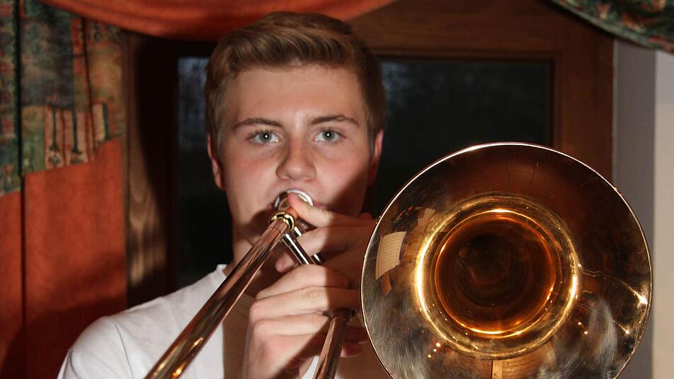 Julian Scheffold, inzwischen 15 Jahre alt, hat seine musikalische Karriere mit fünf Jahren begonnen: Aber nach kurzer Zeit hatte er auf Blockflötenunterricht keine Lust mehr. "Blockflöte war einfach nichts für mich", lacht der 15-Jährige heute noch darüber. Julian probierte im tiefen Blech herum, landete dann bei der Posaune. Seit acht Jahren bekommt er bei Rainer Streit Unterricht. Er hat den musischen Zweig am Markgraf-Georg-Friedrich-Gymnasium gewählt. Und seit Neuestem spielt Julian auch E-Gitarre. Er hat Unterricht bei Eddie Hürdler.