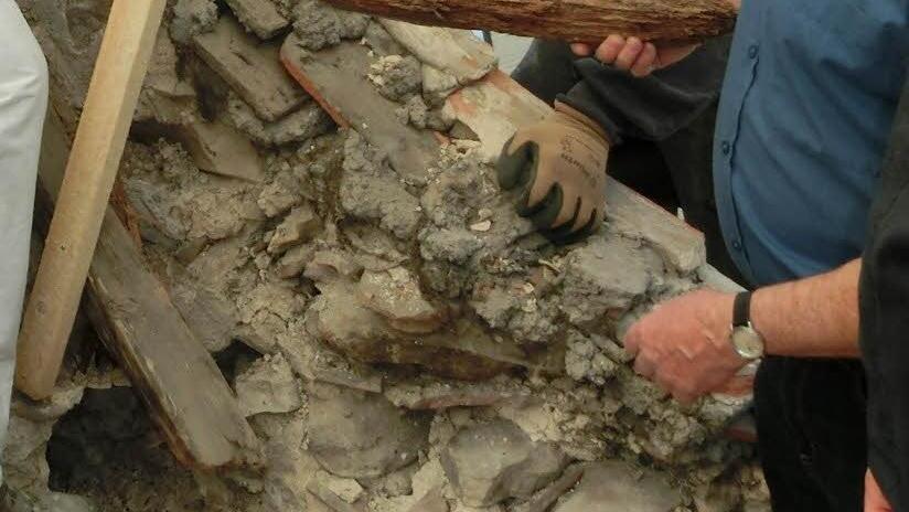 Staubige Angelegenheit Inzwischen für alle sichtbar: Das Gerüst steht, die Zimmerei Schuster arbeitet bereits fleißig. Zunächst haben die Handwerker die Traufenpunkte auf der gesamten Länge des Kirchenschiffes freigelegt, um den Schadensumfang festzustellen. Eine staubige Angelegenheit war für die Männer im Schutzanzug das Entsorgen der losen Schüttung unter dem Dachboden. Derzeit werden im Dachstuhl schadhafte Balken ausgewechselt oder teilweise ergänzt.