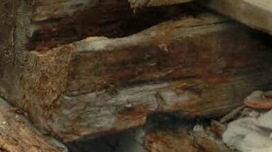 Fachmann Markus Erhardt zeigt, wie die Balken miteinander verbunden werden müssen, damit sie tragfähig bleiben und auch für die Zukunft die komplette Last des Kirchendaches stemmen können. Reine Zimmererkunst eben. Neben den Substanzschäden im Langhaus muss auch die deutliche Verformung des Westgiebels, der am First rund 25 Zentimeter nach außen tritt, stabilisiert werden.