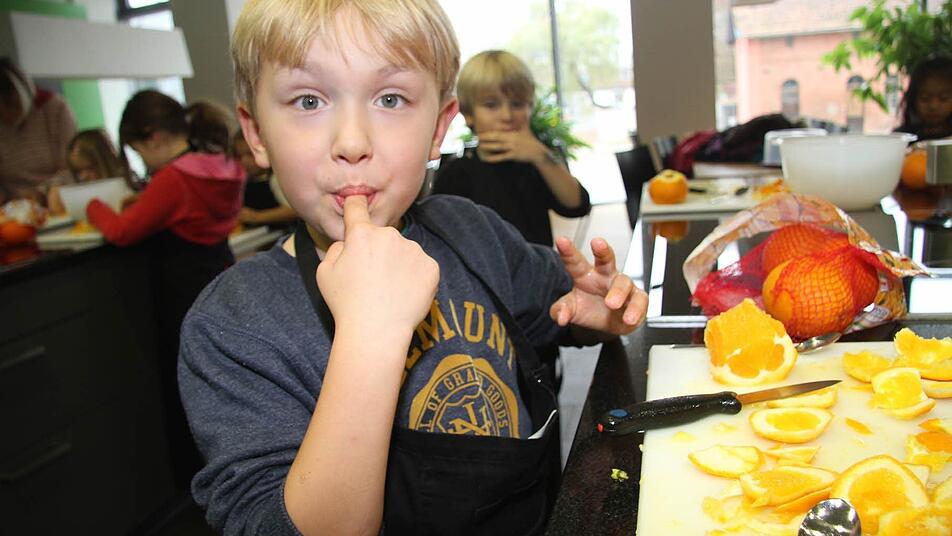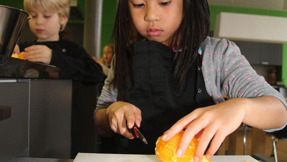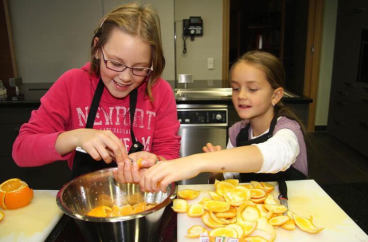 "Auch Männer können kochen" Die Jungs und Mädels haben Orangenmarmelade zubereitet. Dafür haben sie zunächst die Orangen von der Schale befreit. "Das macht Spaß", sagte Dan Ndu (7), die von Uschi Prawitz erfuhr, dass man das Messer nie zum Körper hinführt. Neben ihr schälte Lukas Meile eifrig: "Ich habe noch nie Marmelade gemacht, aber mit der Mama backe ich manchmal Kuchen", verriet der Siebenjährige.