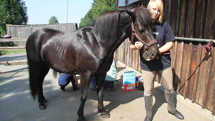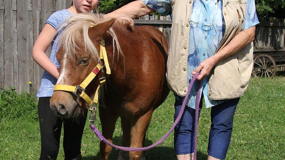 Auch die Mama ist dabei. Sie kennt fast alle Pferde mit Namen. Das älteste ist Pony Flocki, ein besonders liebenswertes Wesen. Flocki hat gerade eine herumstehende Reinigungsbox entdeckt. "Ihr sollt doch die Boxen nicht rumstehen lassen", mahnt Edmund Weidner. Zu spät! Denn Flocki war schneller. Und verspeist jetzt genüsslich die Leckerlis.
