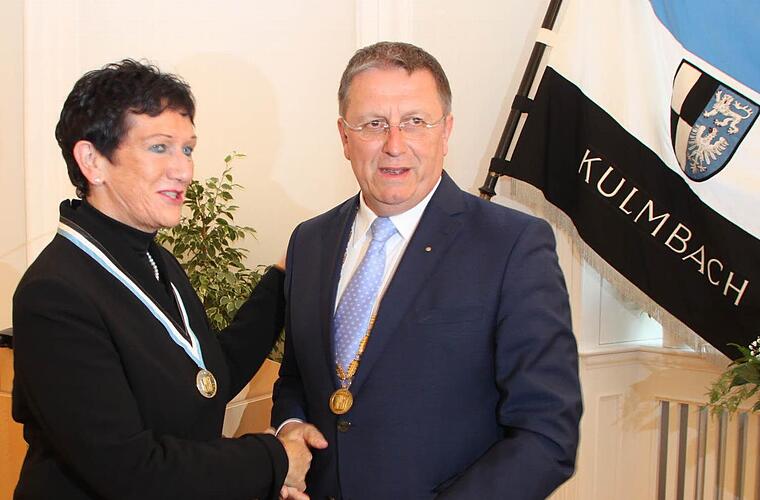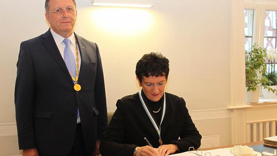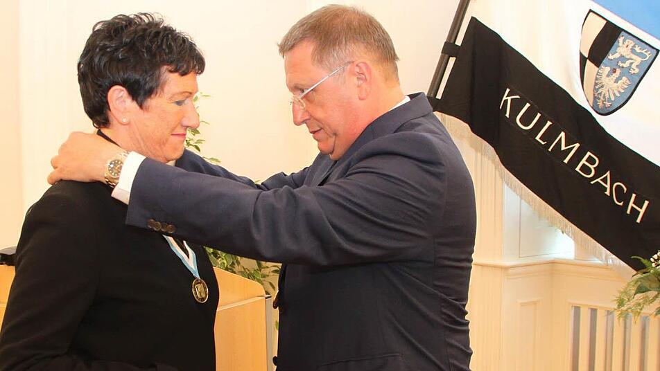 Kulmbach am Donnerstagabend im Rathaus mit Gold dekoriert: Landtagsvizepräsidentin Inge Aures (SPD) erhielt aus den Händen ihres Nachfolgers im Amt des Oberbürgermeisters, Henry Schramm (CSU), die Goldene Bürgermedaille und freute sich über die hohe Ehrung der Stadt Kulmbach. "Ich habe keinen Tag bereut", sagte sie zu ihrem Engagement in der Politik, das 1990 mit dem Einzug in den Stadtrat begann.