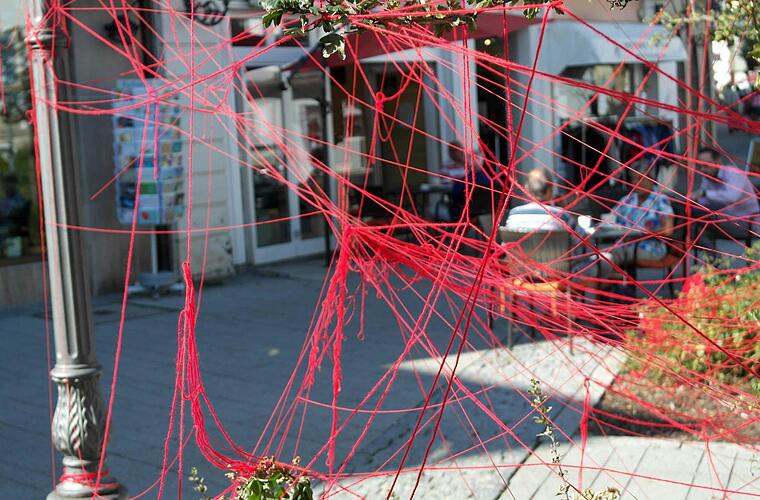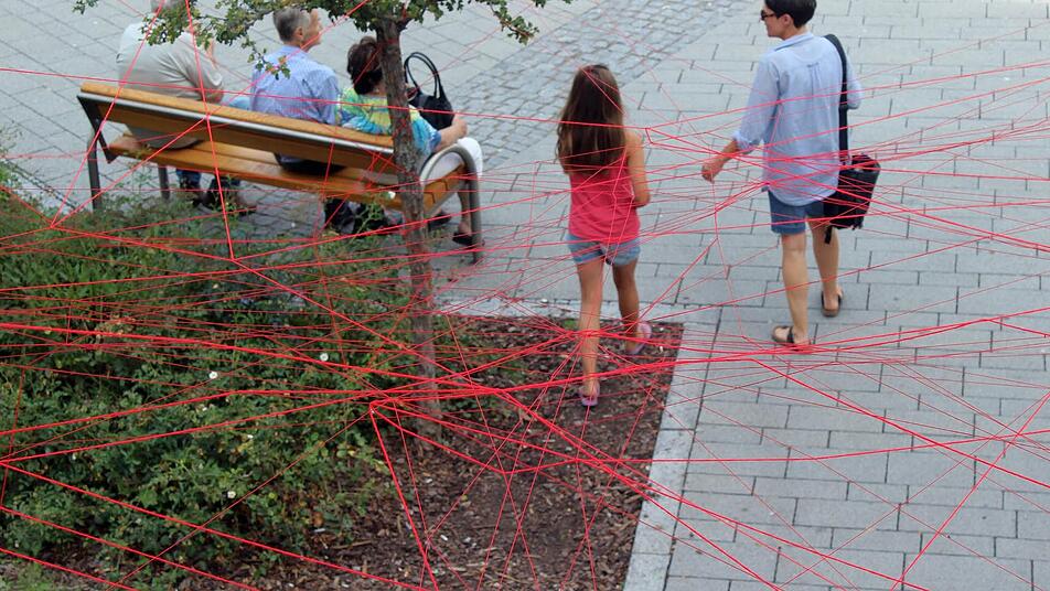Die ältere Dame, die mit ihrem Mann auf der Bank am Eingang der Langgasse sitzt, schüttelt den Kopf. "Die junga Leut, die könna nix Schöns säng!" Mit "Schöns" meint sie das Netzwerk, das noch bis Montag die Ruhezone beim Bratwursthäuschen am Holzmarkt überspannt hat. Jetzt hängen die roten Fäden schlaff herunter, viele davon sind zerrissen. Ein Teil wurde sogar in die dortige Pflanzrabatte geworfen.