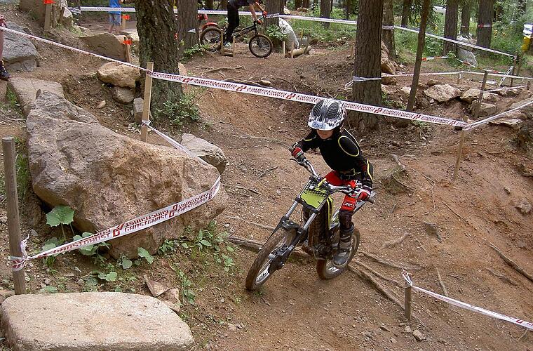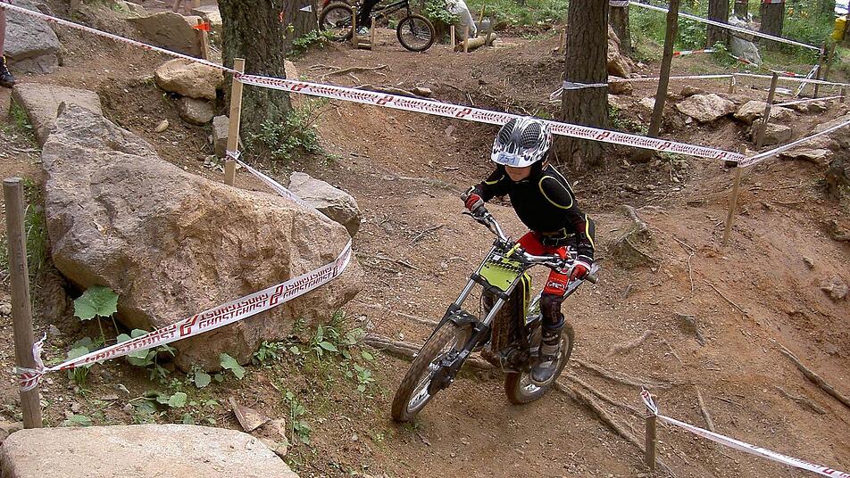 Felix Maiwalds Motorrad hat zwar nicht einmal einen Sitz, aber es könnte bis zu 40 Stundenkilometer schnell fahren. Doch genau darum geht es nicht. Wenn sich der Siebenjährige auf "seine Maschine" stellt, dann muss er Steinbrocken und Felsen überwinden, ohne mit dem Fuß den Boden zu berühren. Er hopst auf einem Rad über Wurzeln, hangelt sich mit einem Reifen über Gelände, das eigentlich nicht befahrbar ist, oder er bezwingt andere Hindernisse. "Man braucht ganz viel Geschicklichkeit und Balance", sagt Felix und findet, dass seine Körperbeherrschung richtig gut geworden ist, seitdem er regelmäßig trainiert.