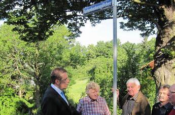 Nachdem die Verbindung bereits als beschränkt-öffentlicher Weg gewidmet ist und ein Straßen- bzw. Wegebenennungsverfahren wegen fehlender Erschließungsfunktion als nicht notwendig erachtet wurde, konnte OB Henry Schramm nun im Beisein von Oswald Ramming und Dr. Ewald Müller den Weg inklusive der entsprechenden Straßenbezeichnungsschilder offiziell zum Kuchenbackersgäßchen erklären.