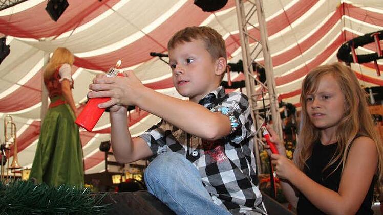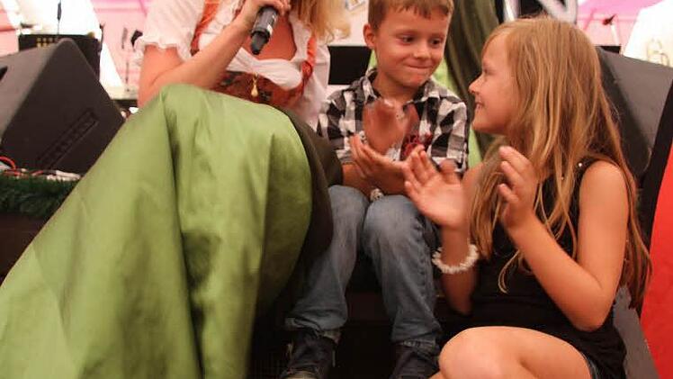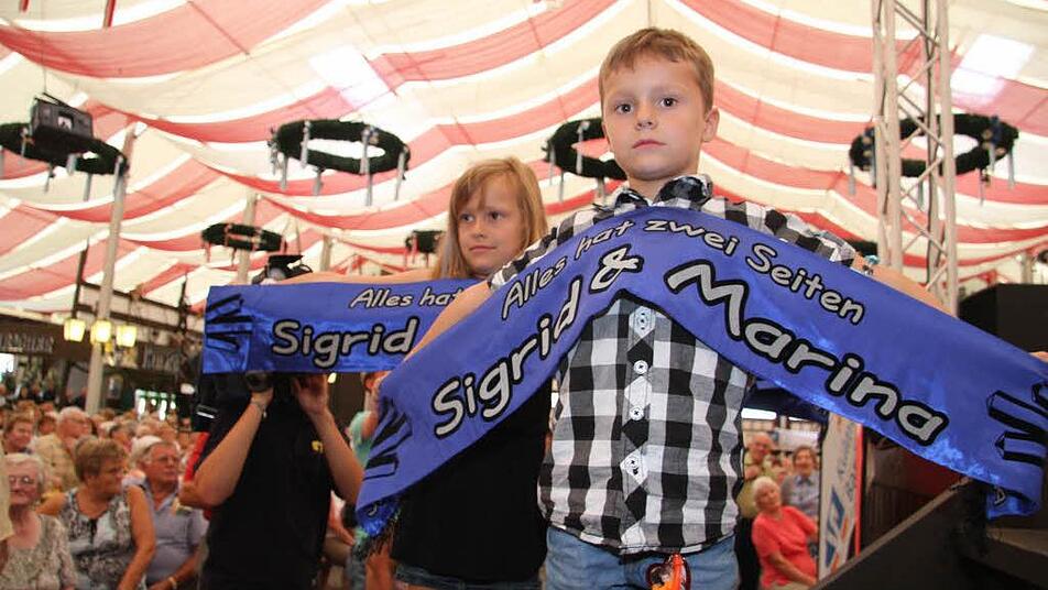 Während Pascal (1,5 Jahre) gemütlich mit Lederhose und Karohemd im Kinderwagen saß und die Bierzeltstimmung mit Opa Werner Clauß (60) direkt am Rande der Bühne genoss, gab es für Luis (6) und Vivienne Hollendonner (7) aus Fassoldshof kein Halten mehr. Die beiden sind riesen Fans von Sigrid und Marina und wollten den beiden Sängerinnen ganz nahe sein. Deshalb kletterten sie auf die oberste Stufe der Treppe zur Bühne und schwenkten die auch Fanschals mit der Aufschrift "Das Leben hat zwei Seiten: Sigrid und Marina!". Und mit Feuerzeugen für die langsamen Lieder waren die zwei Konzertprofis auch ausgestattet.