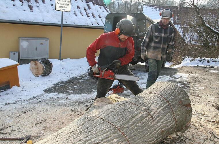 Die Baumkletterer Stefan Nicklas und Tim Ackermann fällten am Rosenmontag den kranken Baum am Gefallenen-Ehrenmal in Metzdorf.