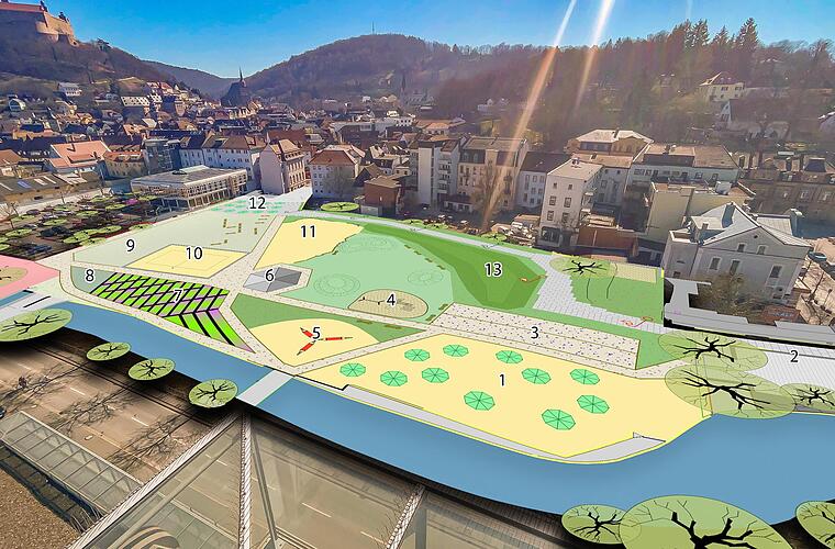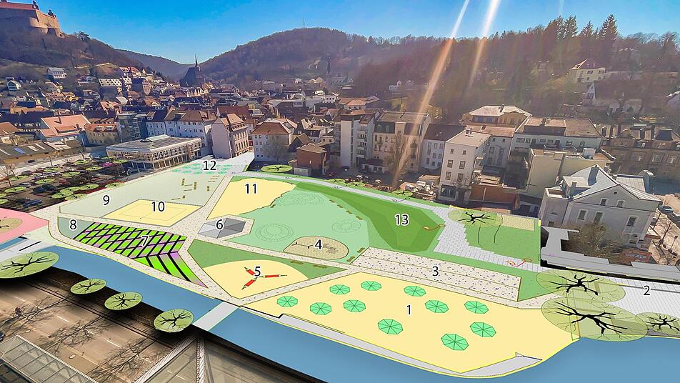 Nach dem Abriss des Kaufplatzgebäudes wurde der Boden mit Recyclingmaterial abgedeckt, für das Freizeitgelände wurde der Boden dann zwischen 22 und 40 cm aufgeschüttet. "Der Bodengutachter sagte, es könnte noch Altlasten geben", sagt Wirth. Auf den Freiflächen zwischen den Wegen werde Spiel- und Sportrasen angesät, mit kleinen Hügelchen, "dort kann man auch zum Beispiel Frisbee spielen." Rund um die Fläche sollen darüber hinaus Blumenwiesen angelegt werden, im Biergartenbereich seien auch Pflanzkübel denkbar.