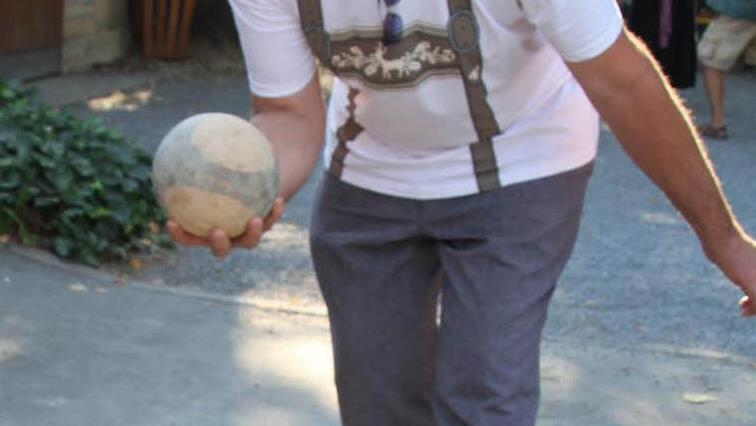 Rolf Täuber ist jetzt an der Reihe. Konzentriert schiebt er Kugel um Kugel. Aber es läuft nicht so wie es sollte. Manchmal wackelt ein Kegel, fällt dann aber doch nicht. "Die Kegel können aber alle umfallen - es gehört immer ein bisschen Glück dazu", sagt Rolf Täuber und sieht das Sandkegeln vor allem als eine Riesen-Gaudi an. Außerdem hat er schon neun Krügla zu Hause.