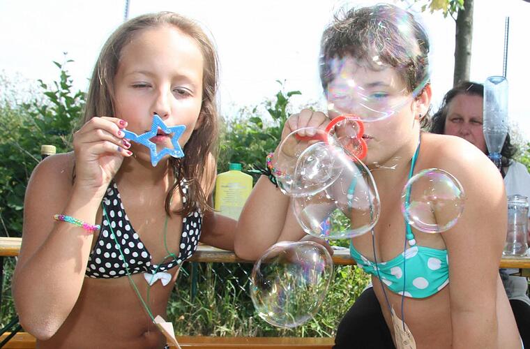 Die Kids liebten es, Joghurtbecher mit der Spritzpistole abzuschießen, mit der Feuerwehrspritze ins Ziel zu treffen oder Seifenblasen zu formen.
