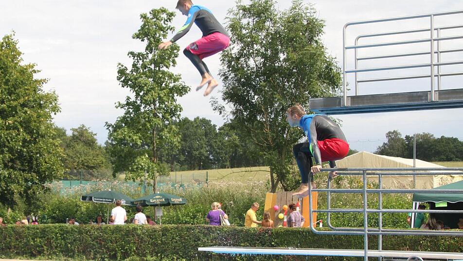 Kunstsprünge vom Drei-Meter-Brett Eine Mega-Attraktion waren die beiden Hüpfburgen. Und Patrick Krasser und Yannick Felbinger zeigten Kunstsprünge vom Dreimeterbrett - einzeln und als Duo.