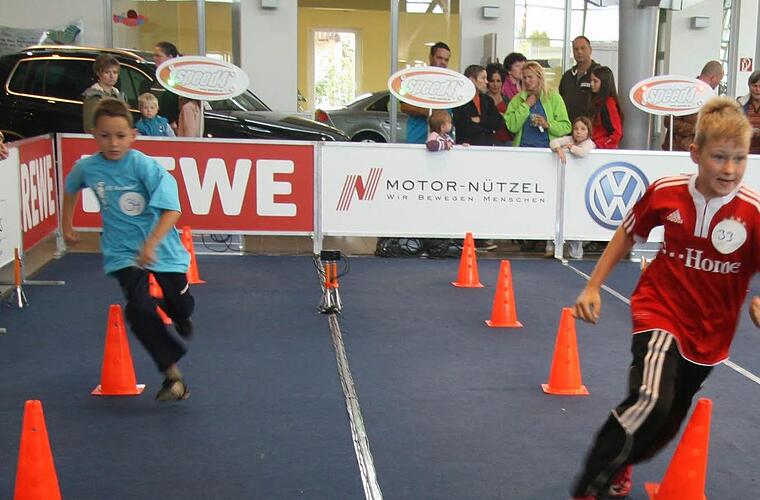 Eigentlich ging es bei der Aktion speed4 nur darum, Kindern Freude an der Bewegung zu vermitteln: Doch das Finale bei Motor Nützel wurde zum Volksfest. Mehr als 750 Besucher kamen ins Kulmbacher Autohaus. Der Leiter der Aktion, Jörg Brisken, probte mit dem Publikum das Klatschen und Anfeuern. Aber das ging dann ganz von selbst, wenn die Kinder am Start zu dem Slalomparcours standen.