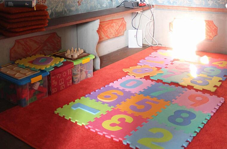 In einer der drei ehemaligen Fürstenlogen liegt ein Teppich, darauf ein Styroporfeld aus Zahlen und einige Kisten mit Spielzeug stehen unter einer Bank. Vor der großen Glaswand, die den Blick auf den Altar freigibt, stehen einige Stühle für die Eltern.