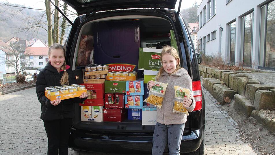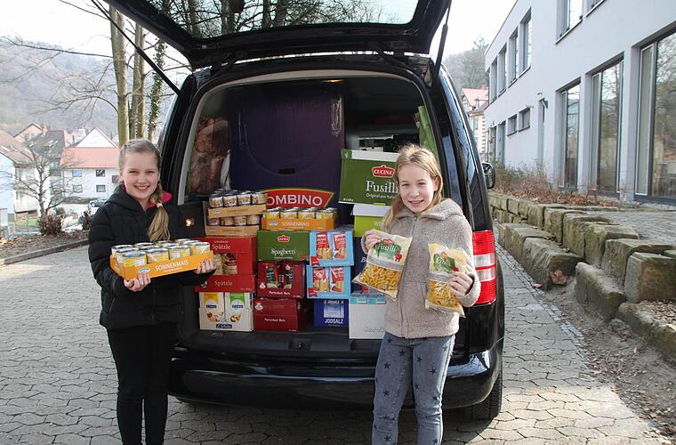 Champignons, Mais, Grieß, Nudeln und andere Lebensmittel laden Scarlett Rosemann und Julia Schmidt in das Auto der Tafel. Das Alles ist bei einem Spendenprojekt zusammengekommen, dass die Fünft klässlerinnen des Markgraf-Georg-Friedrich-Gymnasiums gestartet haben.