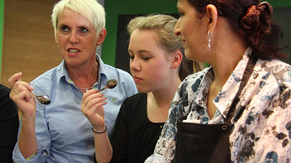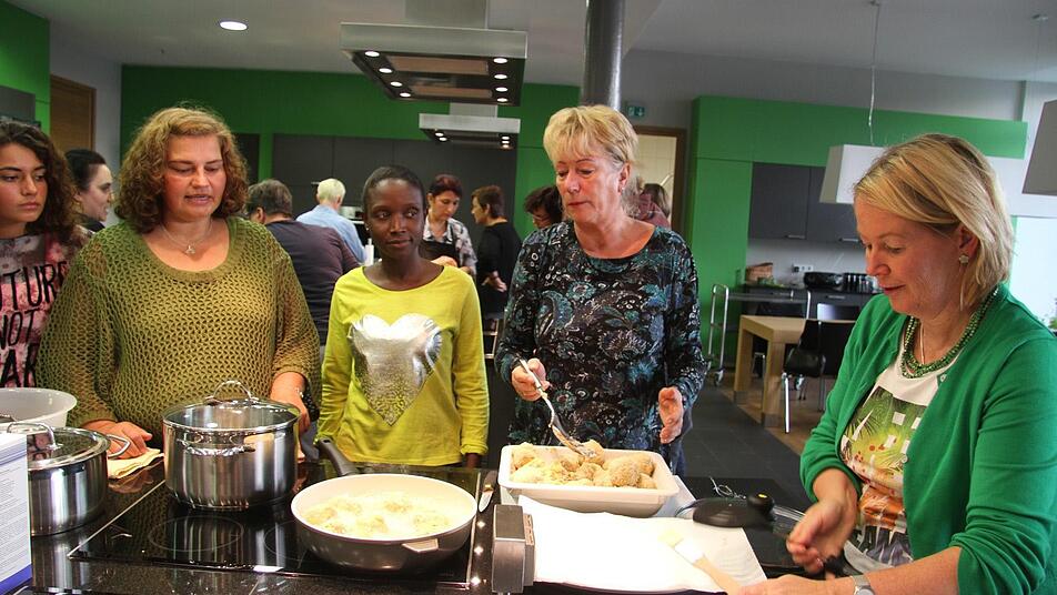 "Die halten wohl durch die Kartoffeln und das Hackfleisch zusammen", mutmaßen die beiden Frauen. Lauchzwiebeln, Knoblauch, Salz und Pfeffer sorgen für die richtige Würze. "Das Fett ist schon heiß genug, soll ich die Bällchen schon frittieren?", fragt Sylvia Krug in die Runde. Auch sie ist beim Kochkurs mit dabei.
