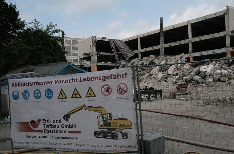 Die Entkernung des Komplexes und die Schadstoffentsorgung sind bereits abgeschlossen, jetzt laufen die reinen Abbrucharbeiten. Bis Ende September soll der Abriss erfolgt sein, bis Ende des Jahres der Abtransport des Materials abgeschlossen werden. Rund 1000 Lkw-Fahrten sind nötig, um die 25 000 bis 30 000 Tonnen Beton und etwa 800 Tonnen Baustahl abzutransportieren.