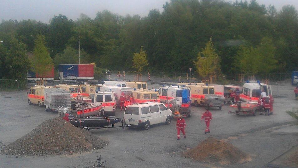 Mit dabei: Der Hochwasser-Rettungszug aus Franken - Bootsführer, Taucher, Retter. Am späten Sonntagnachmittag wird für sie Voralarm ausgelöst.