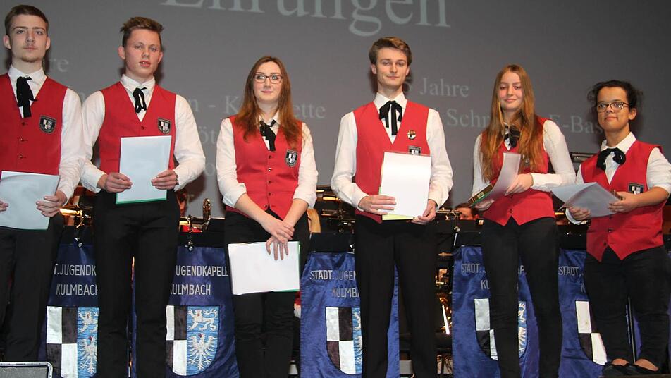 Beim Jahreskonzert zeichneten OB Henry Schramm und Dirigent Harald Streit verdiente Musiker aus. René Schmidt ist seit 15 Jahren in der Jugendkapelle mit von der Partie. Seit fünf Jahren halten Josephine Marie Altmann, Sophie Düreth, Christian Ertl, Franziska Günther, Leonhard Hahn und Hans Schülein dem Ensemble die Treue.