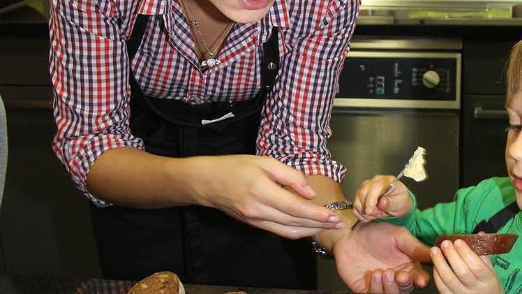 Jasmin Prawitz (10) und Savina Förster (9) schnippelten Radieschen. Denn die sollten auf dem Kräuterquark als optische Verzierung dienen. Niclas Neuber (5) indes ist gerade mal so groß, dass er auf die Arbeitsfläche schauen kann. Aber auch er ist schon mit Feuereifer bei der Sache und schmiert Brote am laufenden Band.