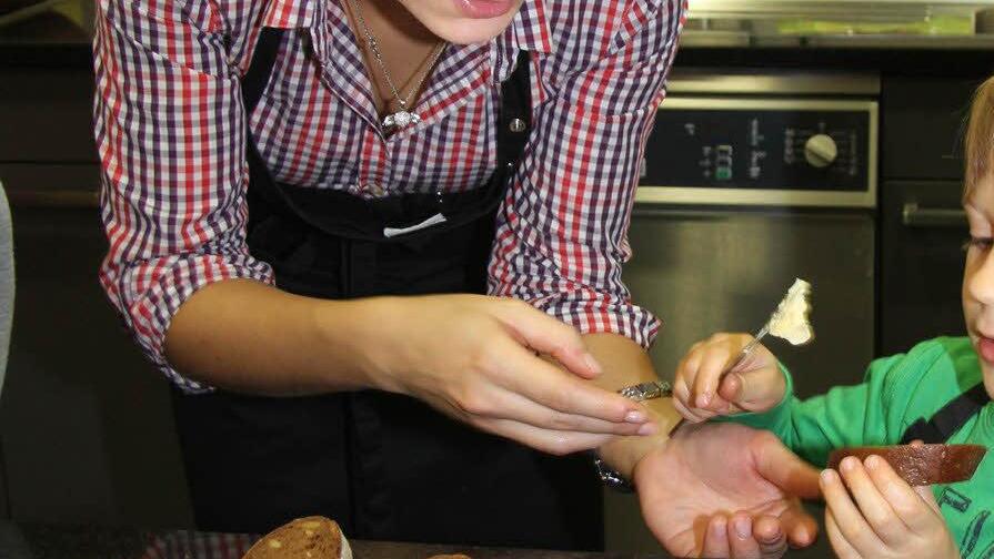 Immer wieder hilft Koch Marcus Schulz und gibt Anleitungen. Und unterdessen kocht er selbst Tomatensugo mit Stern anis und Kürbisaufstrich mit Ingwer-Chili-Note. Denn schließlich sollen die Brote schön bunt und vielfältig sein.
