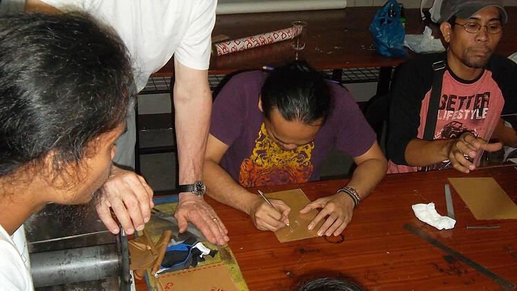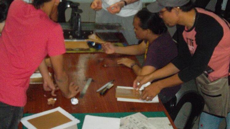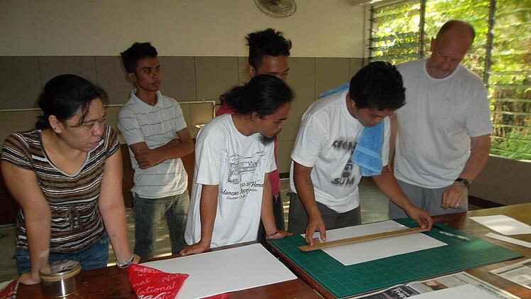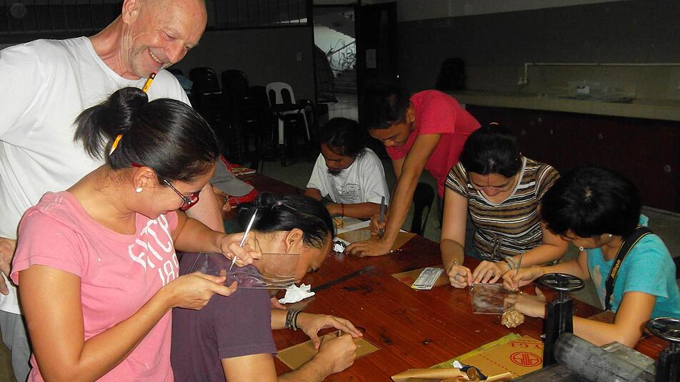 Bei seinem Aufenthalt hat Hans-Dieter Ernst auch einige Veränderungen bewirken können. So baute er an der Universität eine Radier- und Druckwerkstatt von Grund auf. "Es gibt dort quasi keinen Fachhandel für Kunstbedarf, ich habe die Zinkplatten für Ätzradierungen am Straßenrand bei einem Dachdecker organisiert und schneiden lassen. Die Druckfarbe habe ich aus einer Autowerkstatt besorgt", erzählt Ernst. Dieses Unterfangen war ein Abenteuer. Doch das Experiment ist geglückt. "Wir konnten schließlich mit den improvisierten Materialien wirklich Kaltnadel- und Ätzradierungen drucken", so Ernst. Die Radierwerkstatt soll weiter ausgebaut werden. Der deutsche Experte hat Kontakte zu einem Kunstmaterialienhändler hergestellt. "Und wenn die Materialen geliefert sind, werde ich noch einmal auf die Philippinen kommen und zeigen, wie man Aquatinta-Radierungen herstellt", freut er sich schon.