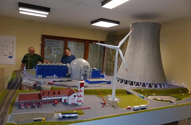 So auch Vater und Sohn Kortschak aus Fölschnitz, die beide bei den Kulmbacher Eisenbahnfreunden aktiv sind. Vor zwölf Jahren haben der heute 62-jährige Maschinenbauingenieur Helmut und sein Sohn, der 31-jährige Softwareentwickler Thomas Kortschack, in der alte Poststelle in Fölschnitz begonnen, ein Atomkraftwerk, angelehnt an das AKW Lingen an dem Ems, für die Modellbahn der Eisenbahnfreunde Kulmbach zu planen. Für die alternative Energieerzeugung sollte auch noch ein Windrad für die Modellbahnanlage entstehen.