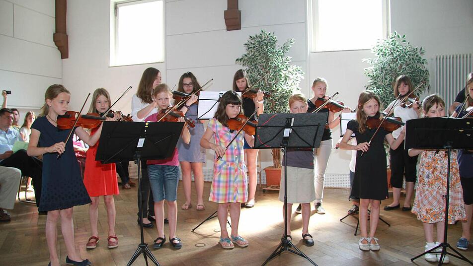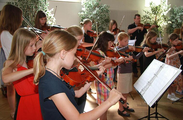 Als eine der positivsten entpuppte sich das Streicher-Projekt-Orchester, dessen Mitglieder nicht nur durch ihre Vielzahl, sondern auch durch ihre Leistung beeindruckten. 21 Ministreicher, die unter den Fittichen von Katherine Hubert die ersten Ensemble-Erfahrungen machen durften, und schon etwas weiter Fortgeschrittene, mit denen Albert Hubert die Werke einstudiert hatte, machten zum Jahresabschluss gemeinsame Sache und musizierten "Marcia op. 4" von Oskar Rieding. Das Gemeinschaftswerk klang ausgesprochen gut.