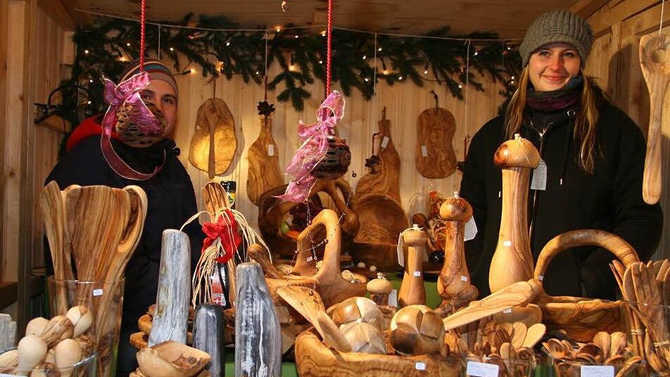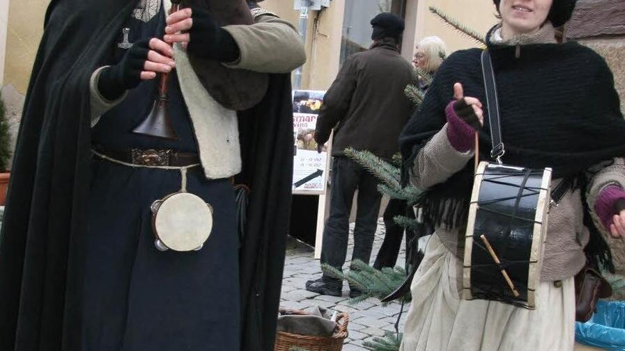 Auf dem Kulmbacher Weihnachtsmarkt wird auch gesägt und geschmiedet, und Dudelsackspieler Mario Schedel und seine Frau Sandra sorgen für musikalische Unterhaltung.