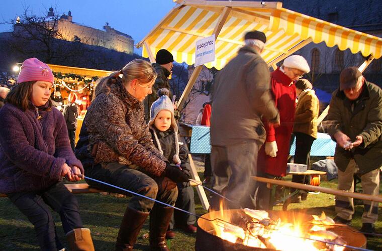 Geduldiger Esel Beim Adventsmarkt in der Villa der Geschwister-Gummi-Stiftung im Schießgraben ist sogar eine lebende Krippe mit einem Schaf und einem geduldigen Esel, der sich von Hunderten Kinderhänden streicheln lässt, aufgebaut. Die Kleinen und die Eltern vergnügen sich beim Stockbrotgrillen am offenen Lagerfeuer vor der Kulisse der Plassenburg.
