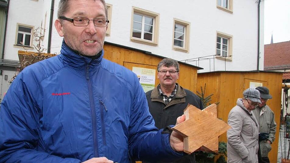 Arbeiten aus Holz sind immer ein Renner. Auch der Stand von Peter Rösner aus Kasendorf ist immer dicht umlagert. "Es ist doch nur ein Hobby", sagt er Kasendorfer bescheiden und präsentiert Hunderte filigran gesägter Sterne, Sternenkinder und Sterne von Bethlehem mit der Krippenszene. "Das mache ich mit der Dekupiersäge", sagt Rösner, und mancher Bastler staunt, dass das Birkensperrholz nur einem Millimeter dick, also hauchzart ist.