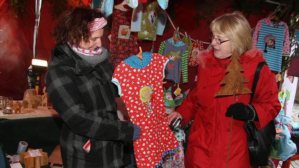 Ein paar Meter weiter ein neuer Marktstand: Michaela Stapf aus Kupferberg präsentiert selbstgemachte bunte Kinderkleidung mit Gute-Laune-Faktor. Total im Trend liegen skandinavische Deko stücke. Rosemarie Pfaffenberger hat Lebkuchenmänner und Tilda-Engel im Skandinavian-Look genäht.