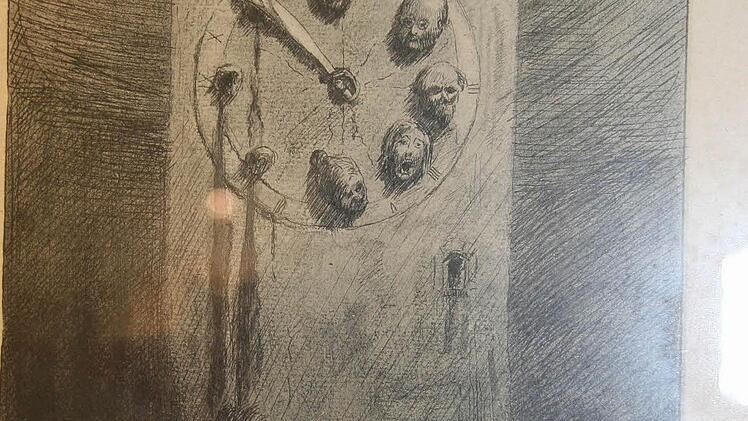 Eine Uhr, deren Zeiger zu jeder Stunde einen Kopf abschlägt. Ein verhüllter Mensch, der andere Kreaturen - scheinbar regungslos - in den schwarzen Abgrund kehrt. Oder überdimensionale grauenhafte Gestalten und Skelette, so interpretiert Alfred Kubin die Bedrohungen der Zeit. Caspar Walter Rauh, der in diesem Jahr seinen 100. Geburtstag hätte feiern können, verarbeitet in seinen Bildern die Erfahrungen seiner Kriegseinsätze in Polen, in Frankreich, in Russland.