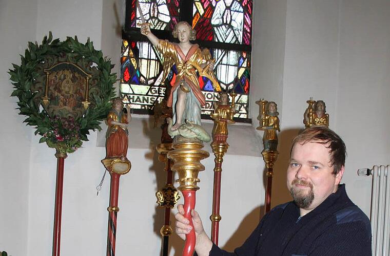 Wenn Mesner Andreas Dremer seinen Rundgang durch die Kirche St. Michael macht, bleibt jedes Mal sein Blick an den Zunftstäben der Pfarrei hängen. Sie fristen unterm Jahr in der kleinen Taufkapelle ihr Dasein. "Einige Teile sind lose, die Fassung muss erneuert werden. Außerdem sind einige Figuren sehr stark nachgedunkelt, sie müssen gereinigt werden", klagt der Mesner. "Jedes Mal, wenn er in die grauen Gesichter der Heiligen blickt, hofft er auf Unterstützung.