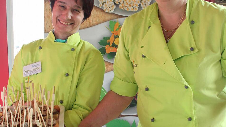 Karlheinz Babinsky aus Kronach probiert die Leckereien, die ihm Sabine Schnupp reicht. Die Chefin des Brauerei-Gasthofs Schnupp in Altdrossenfeld ist Wildkräuterexpertin und Mitglied im Verein "Essbares Fichtelgebirge". Zusammen mit anderen Vereinen repräsentierte sie am Freitag im Regionalpavillon der Landesgartenschau die Gemeinde Neudrossenfeld.