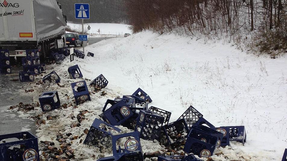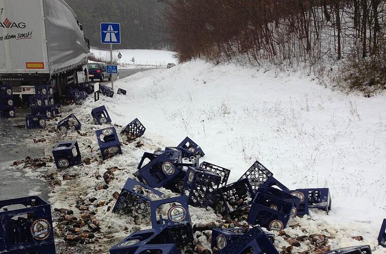 Vermutlich aufgrund der winterlichen Straßenverhältnisse ist an der Autobahn-Anschlussstelle Neudrossenfeld ein Lastwagen verunglückt und hat einen Großteil dseiner ungesicherten Ladung aus Bierkästen verloren.