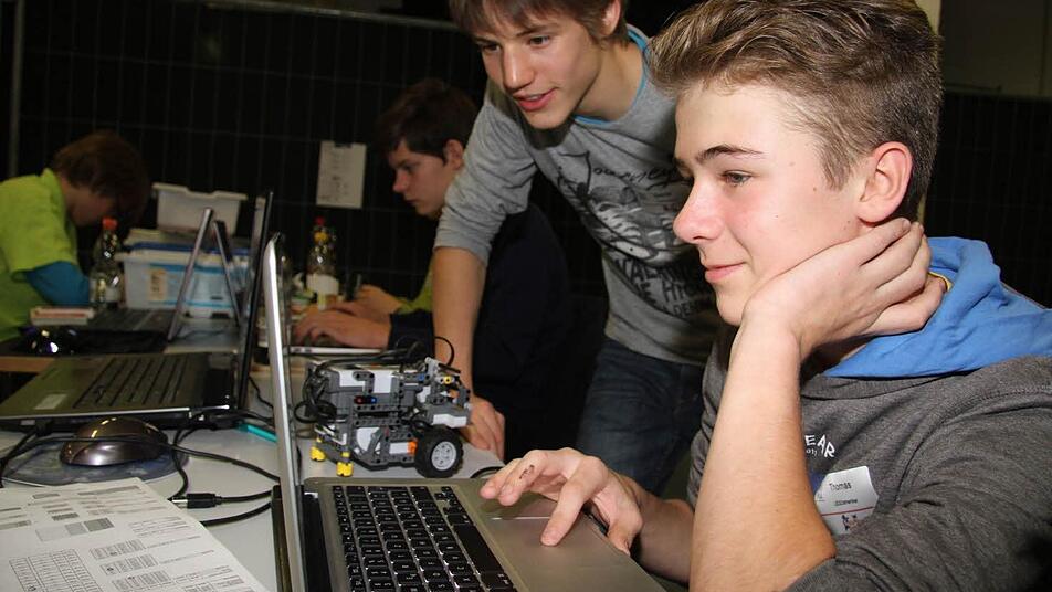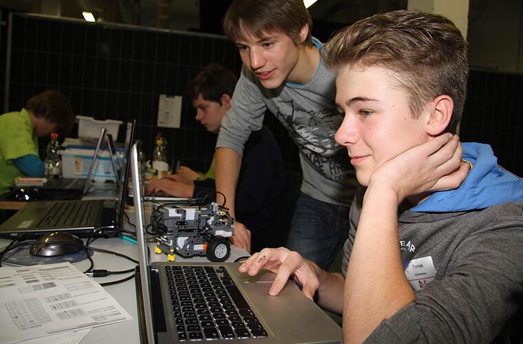 Probleme mit dem Programm "Unser Problem war, dass wir den Roboter noch einmal kurz vorher umgebaut haben. Das Programm hat dann nicht mehr gepasst", schätzt Gabriel Moser (16) die Lage richtig ein. Er programmiert auch während des Wettbewerbs noch weiter. "Ach, so schlecht sind wir gar nicht. Wir sind noch im Rennen. Denn wir liegen auf Platz sieben", macht Lehrer Wolfgang Lormes seinen Schützlingen Mut.