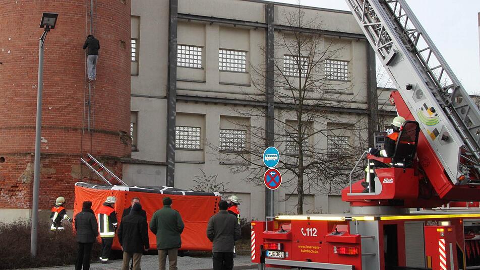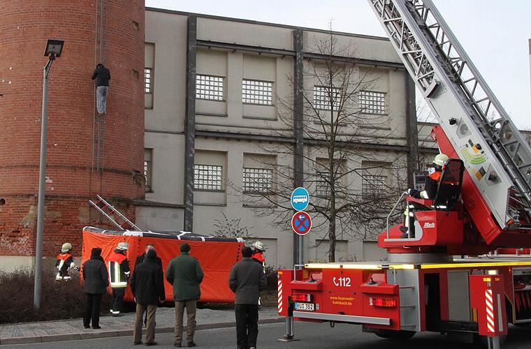 Am Fuß des Backstein-Schlots hat die Feuerwehr ein Rettungskissen aufgebaut, das glücklicherweise nicht gebraucht wird. Spezialisten der Polizei sprechen von der Drehleiter aus mit dem 23-Jährigen, um ihn zu beruhigen und zum Aufgeben zu bewegen.