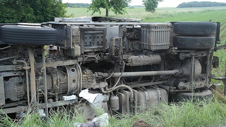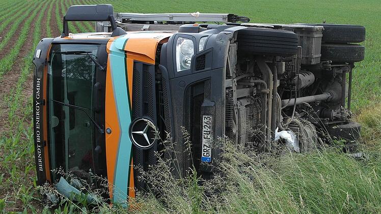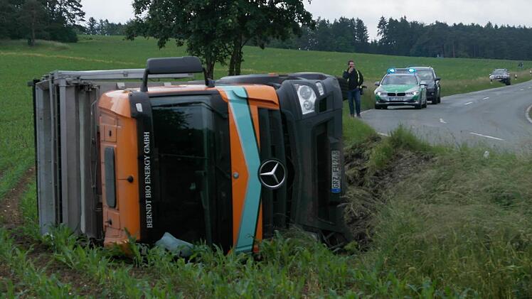 Bei Azendorf kam am Vormittag ein 14-Tonner mit Tierkadavern von der Straße ab. Die Polizei vermutet, dass dem Fahrer ein Starkregen zum Verhängnis wurde.