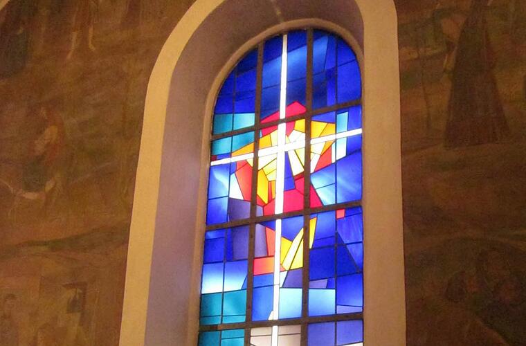 Kontrast durch Wandmalerei Pfarrer Schaefer zufolge gibt es 1993 ebenfalls Überlegungen, die Wandmalerei an der Ostseite des Kirchenraums zu entfernen. Das Gemälde, das das Buntglasfenster umgibt, erzählt im Stil klassischer Bibelmalerei das Leben Jesu und zeigt die wichtigsten Stationen von der Geburt bis zur Himmelfahrt. "Nach Protesten aus den Reihen der Gemeinde hat man aber alles so gelassen, wie es war", sagt Schaefer und findet, dass das 1956/57 geschaffene Wandgemälde und das moderne Fenster "einen interessanten Kontrast und Spannungsbogen" bilden.