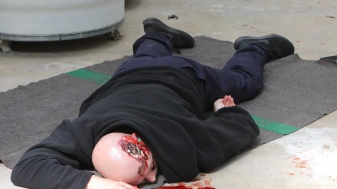 Aber noch ist es nicht so weit. Die mit Maschinenpistolen ausgerüsteten Einsatztrupps arbeiten sich langsam vor, müssen sich absichern, um nicht selbst zur Zielscheibe zu werden. Nicht allen gelingt das. Immer wieder liegen "tote" Beamte am Boden. Vor allem unter den ersten Kräften vor Ort sind Opfer zu verzeichnen. Sie sind in eine Sprengfalle und unter feindliches Feuer geraten.