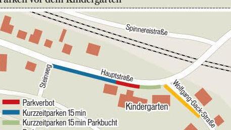 Von der Abzweigung Steinweg bis zur Einfahrt hinter den Kindergarten soll eine Kurzzeit-Parkzone (15 Minuten) eingeführt werden. Dann gilt ein knapp 40 Meter langes Halteverbot bis zur Parkbucht vor der Einrichtung. Davon war schon ein Teil wegen des Hydranten fürs Parken verboten (abgesenkter Bordstein). In der Parkbucht darf dann wieder 15 Minuten geparkt werden. Unbegrenztes Parken ist dann in der Wolfgang-Gack-Straße gestattet.