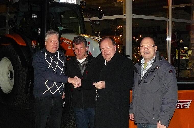 Bei der Übergabe des Steyr-Profi 4139 CVT bei der Firma Horn in Eppenreuth erhielt Bürgermeister Werner Burger den Schlüssel von Ewald Heppt von der Firma Müller-Landtechnik in Burghausen - und gab ihn gleich an den gemeindlichen Bauhofleiter Klaus Keil weiter.