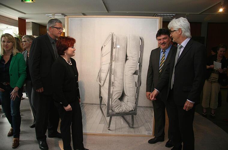 Bis zum 7. Juli - an diesem Tag feiert das Haus Schmeilsdorf sein Jubiläumsfest - kann diese Neuinterpretation der Werke der Barmherzigkeit im Foyer des Landratsamtes bewundert werden.