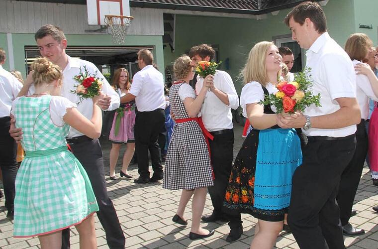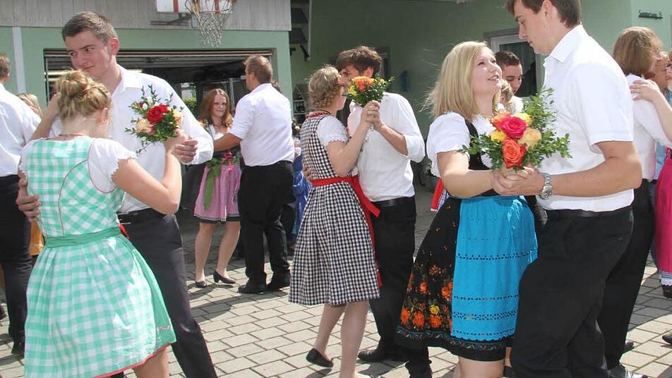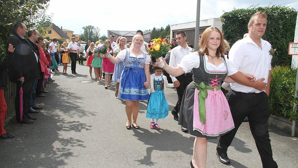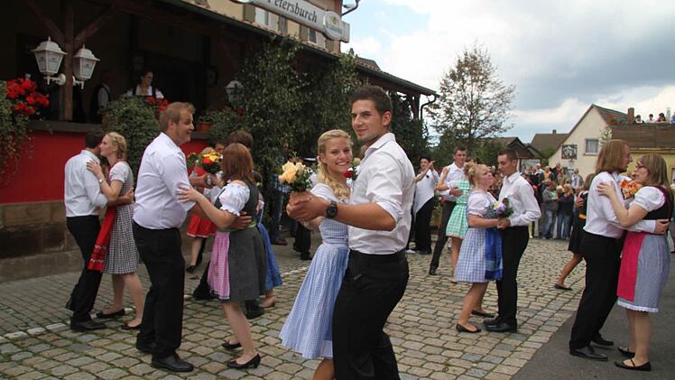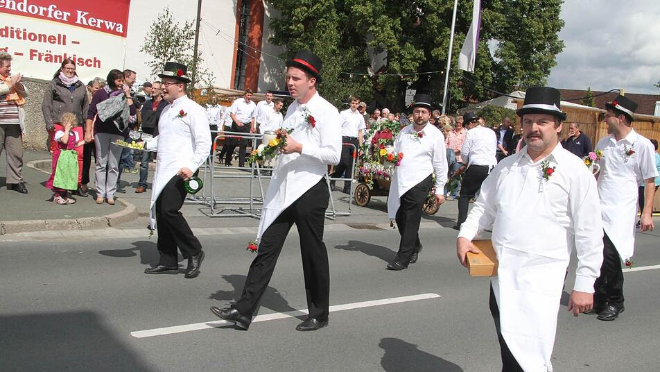 Von der Kirche aus zogen die Plotzer - erkennbar am Zylinder - und die Kerwaburschen durch die Melkendorfer Siedlung und holten die Mädchen ab. Vor jedem Haus wurde getanzt. Ein weiteres Tänzchen legten die Paare vor den Wirtschaften und natürlich vor der Kirche hin. Übrigens dauert die Kerwa auch am Montag noch an. Erst am Dienstag wird die Kerwa in feierlicher Zeremonie wieder eingegraben.