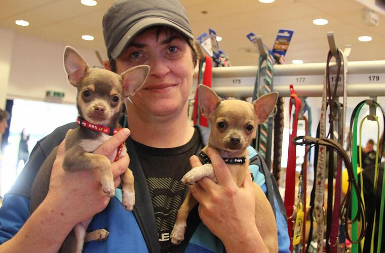 Was es nicht alles gibt: Bei der ersten Haustiermesse wurden Pullover für den Kleinsthund angeboten und Scooter, die der Hund ziehen muss.