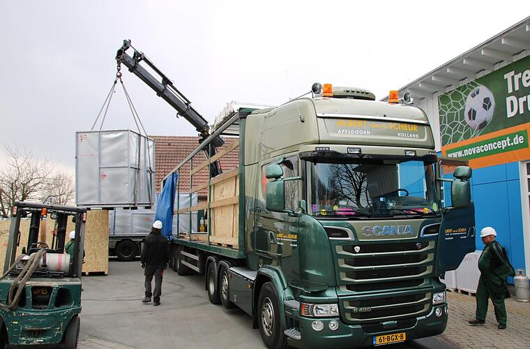 Das künftige Herzstück der Firma Novaconcept Schorsch wurde am Dienstag auf vier Lastwagen angeliefert.